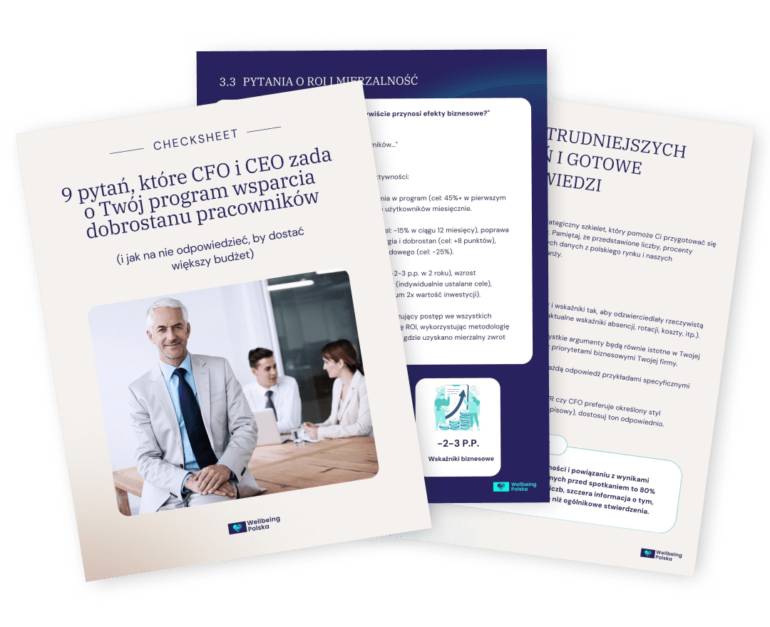 Pobierz e-book Wellbeing Polska i odkryj, jak dbanie o dobrostan pracowników może pozytywnie wpływać na kluczowe wskaźniki wydajności (KPI) Twojego biznesu.